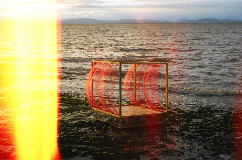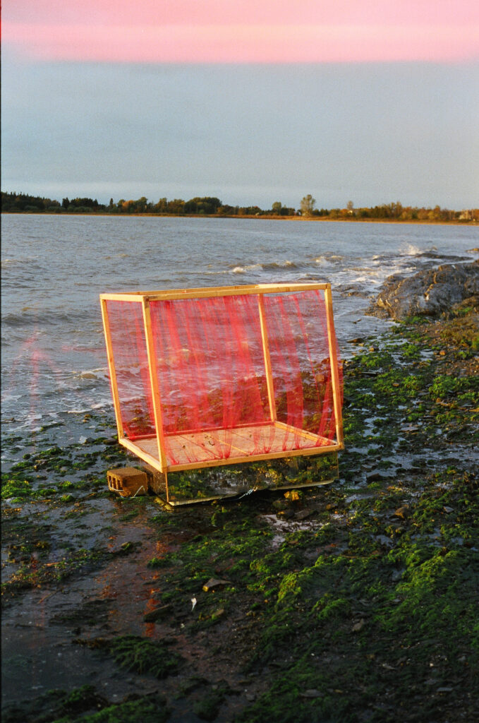 La lanterne met en opposition différents éléments: la lumière et l’eau s’entremêlent. Le rouge se perd dans le bleu. Elle est une petite fenêtre qui glisse sur les vagues et permet d’entrevoir le paysage à travers elle.
